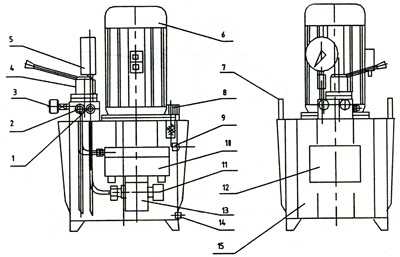 12、標(biāo)牌 13、低壓泵 14、放油螺 15、油箱